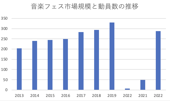 2019年までは前年を大きく上回っていた音楽フェス。2020年のコロナで一気になくなり、2022年にやっと復活が見えてきたと言った感じでした。まだ2019年の水準には戻っていない状況。